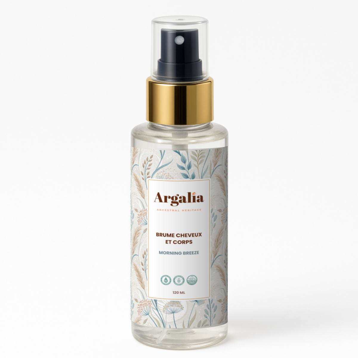 La Brume Corps et Cheveux Argalia aux notes fraîches Morning Breeze, une brise matinale vivifiante aux accents aquatiques enveloppe votre peau et vos cheveux d'un voile parfumé, frais et subtilement scintillant.