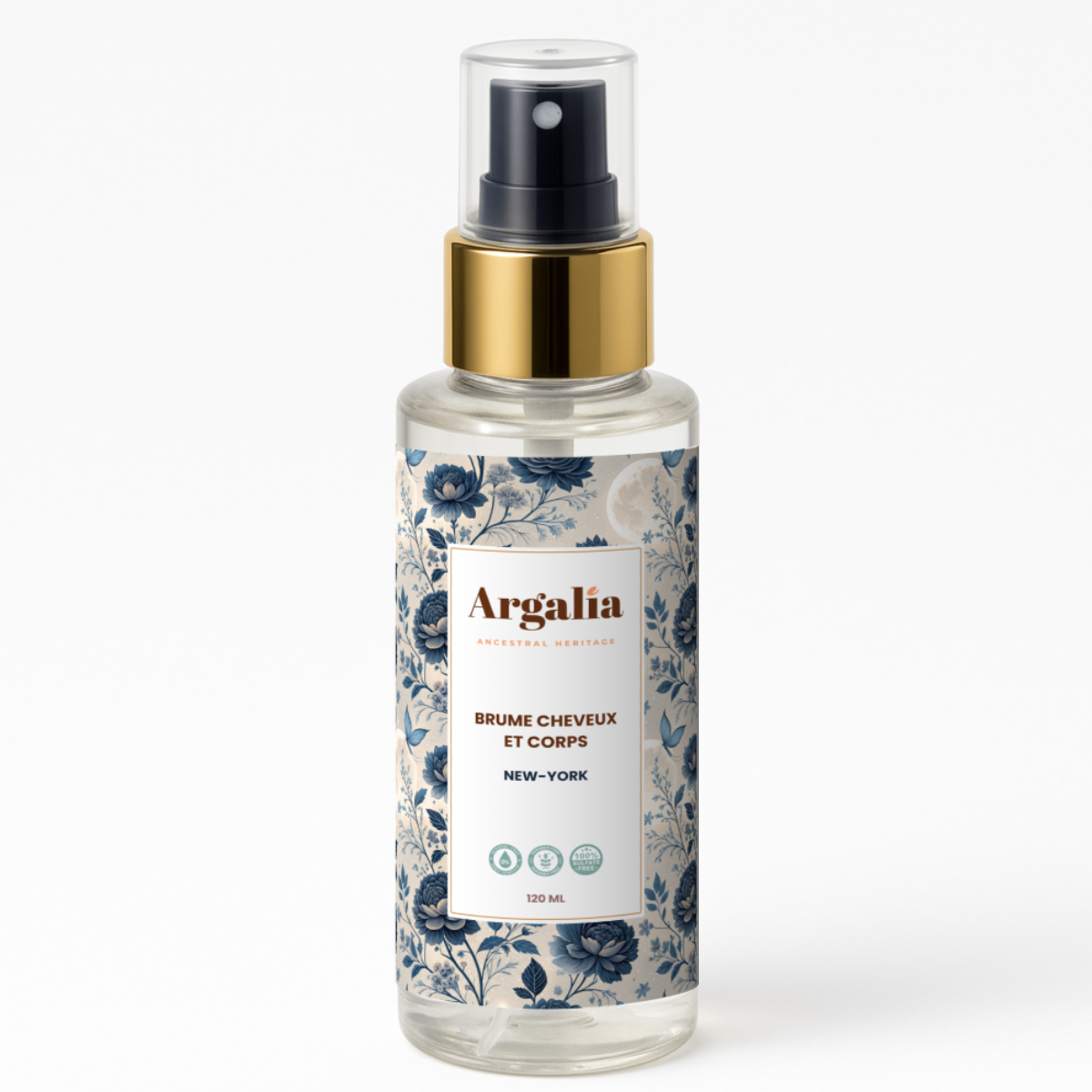La Brume Corps et Cheveux Argalia aux notes urbaines et sophistiquées New-York, un accord moderne et élégant enveloppe votre peau et vos cheveux d'un voile parfumé, frais et subtilement scintillant.